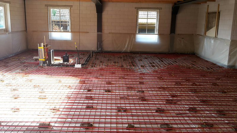 - Aanleg van vloerverwarming als hoofd- of bijverwarming.